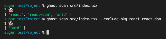 ghost scan [pattern...] --exclude-pkg [pkgName...]ghost scan src/index.tsx --exclude-pkg react react-dom
