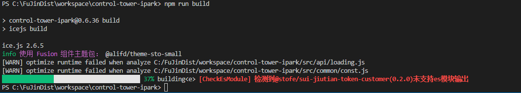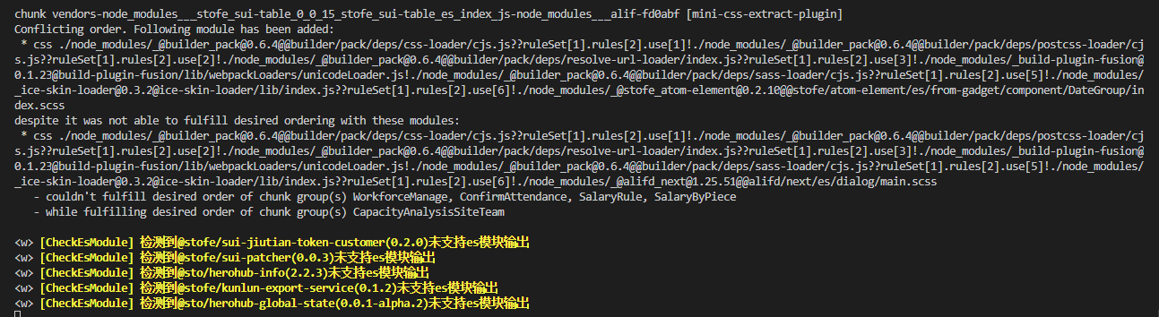 + 在使用了该插件后,在本地开发中如果检测到某个snpm包不支持esmodule,则会进行警告处理,如下图