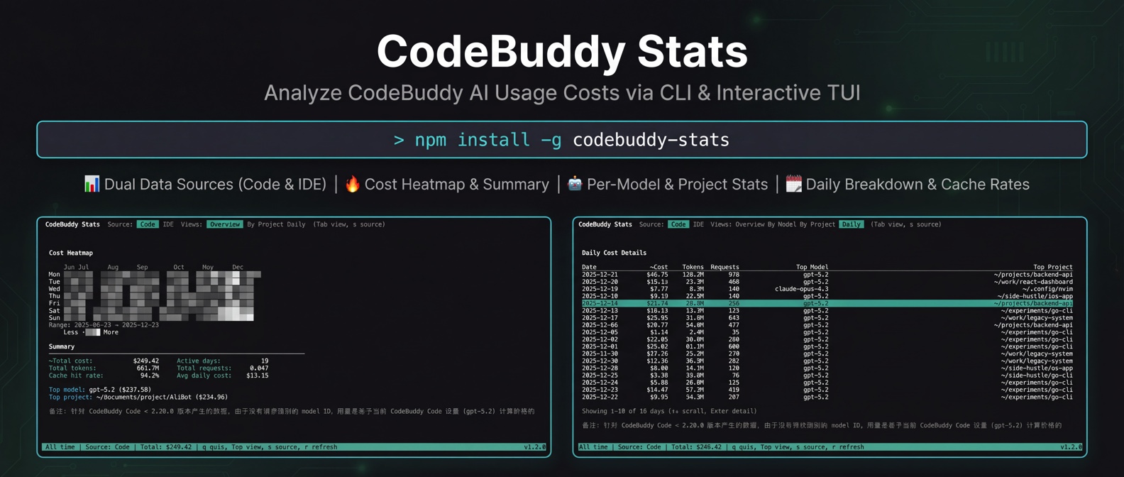 npm install codebuddy-stats一个用于分析 CodeBuddy 系列产品使用成本的命令行工具,支持交互式 TUI 界面和纯文本输出。