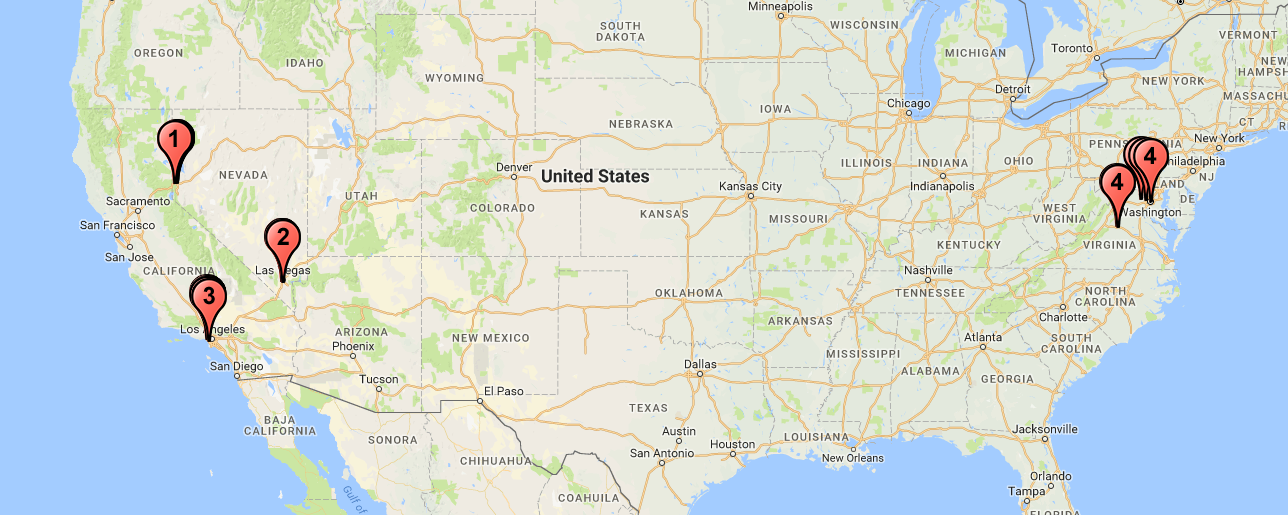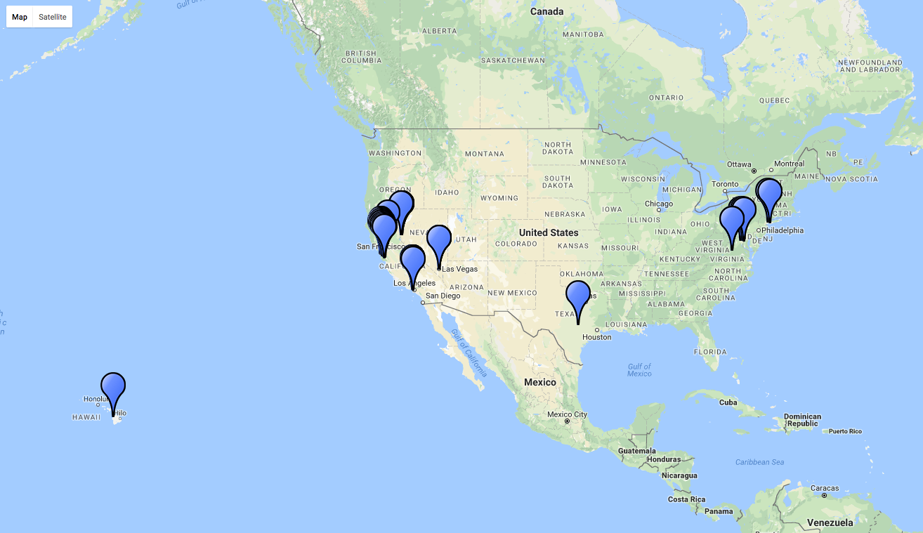 These points are extracted from an individual's Facebook check-ins. Some of the points are discarded as noise points. For example, the one in Hawaii or the few ones in Africa. `javascript
