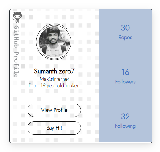npm install github-devprofileUse this minimal and beautiful github profile card in your personal site.