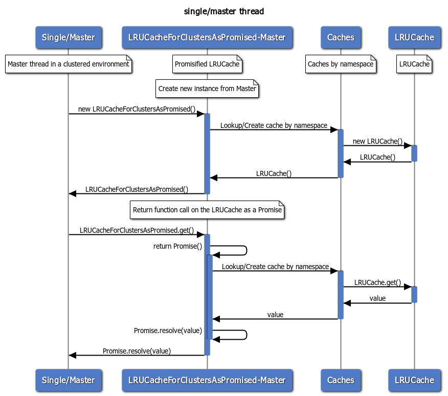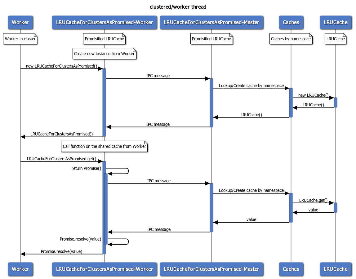 When creating a new instance and cluster.isMaster === true the shared cache is checked based on the and the shared cache is populated, it will be used instead but acted on locally rather than via IPC messages. If the shared cache is not populated a new LRUCache instance is returned.