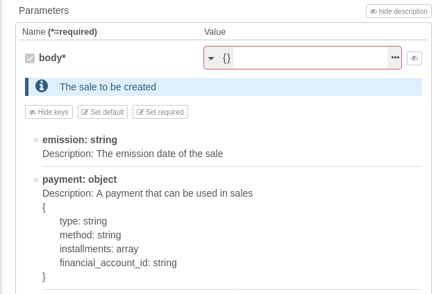 JSON parameters may define a sample structure. You can set this as the value by clicking the corresponding button - either with only the required keys (set required) or with all keys (set default).