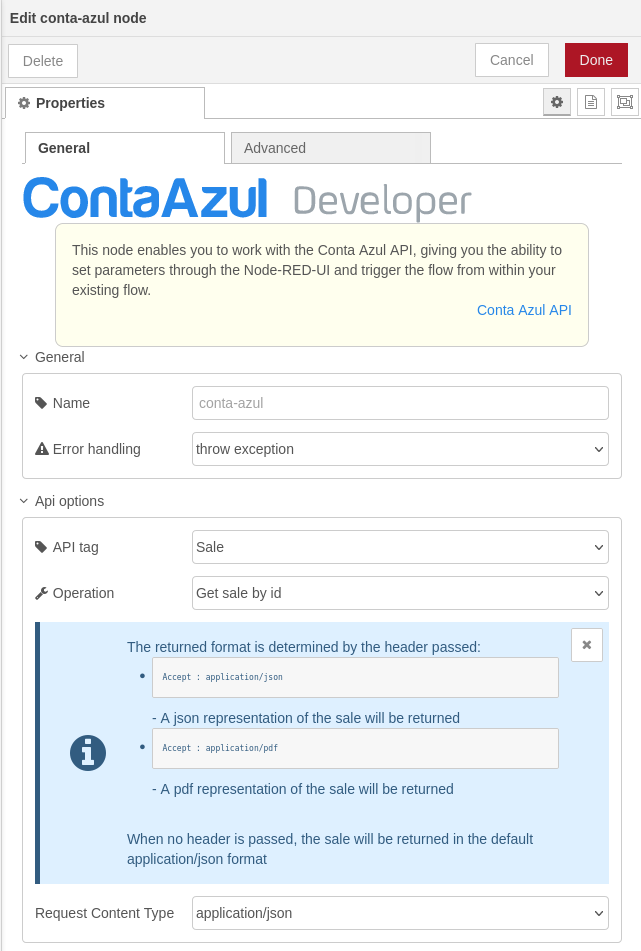This node enables you to work with the Conta Azul API, giving you the ability to set parameters through the Node-RED-UI and trigger the flow from within your existing flow.