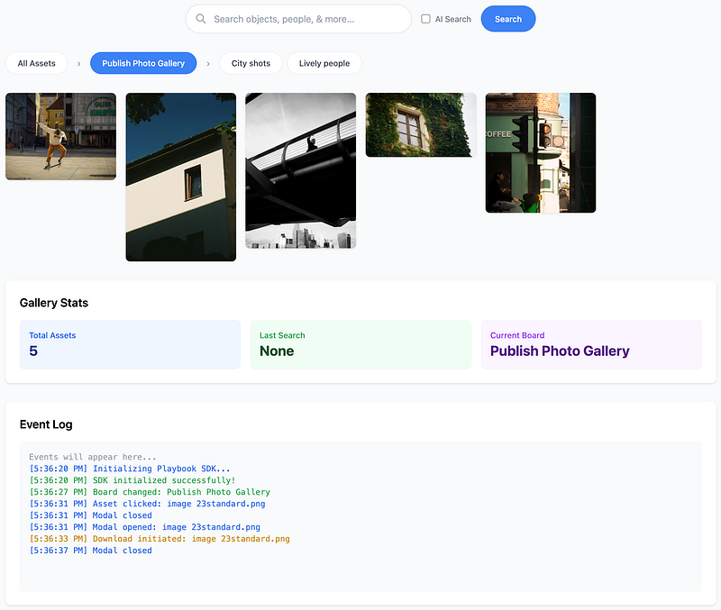 npm install playbook-sdkA lightweight frontend SDK for creating masonry grid galleries with search, board navigation, and modal views. Works for asset management, photo galleries, and media libraries.