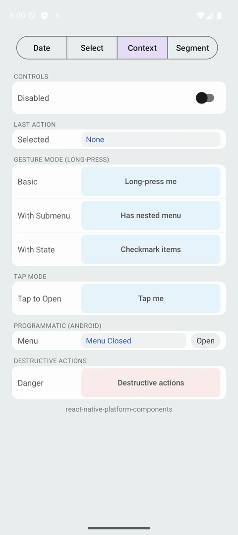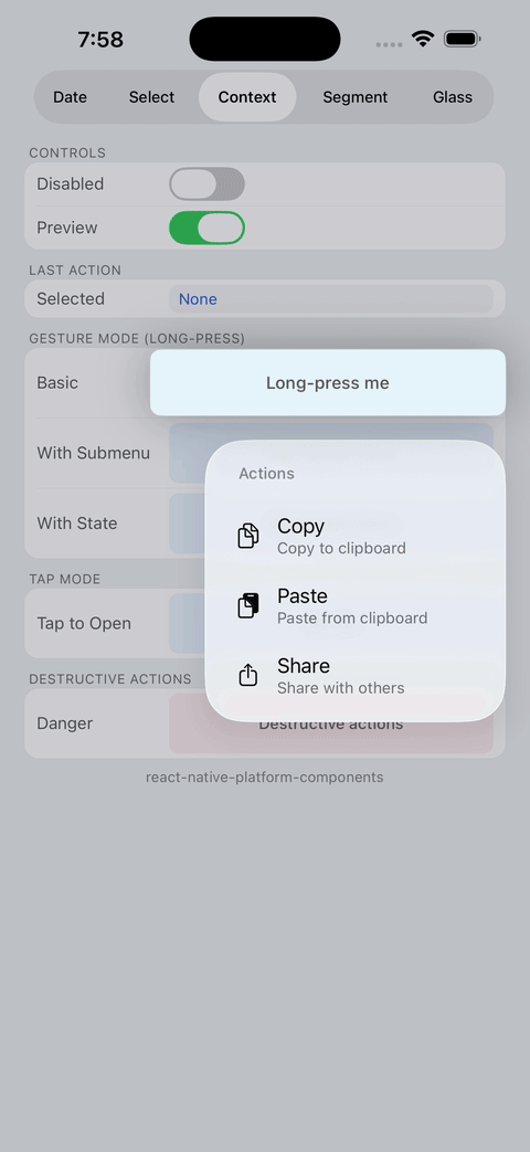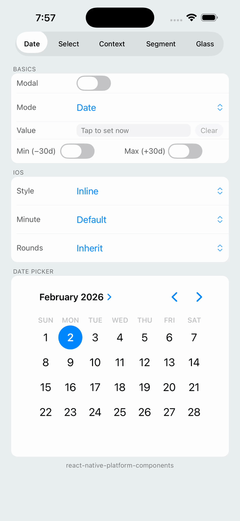 Native UI components for React Native: DatePicker, ContextMenu, SelectionMenu, SegmentedControl, LiquidGlass.