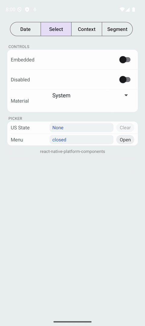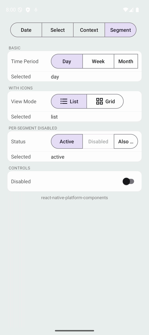 - SegmentedControl – native segmented controls (UISegmentedControl on iOS, MaterialButtonToggleGroup on Android)