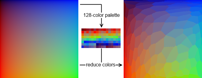 RgbQuant.js, as any quantizer, makes trade-offs which affect its performance in certain cases. Some parameters may be tweaked to improve the quality of the output at the expense of palette computation and reduction speed. Since the methods used to determine the palette are based on occurrence counts of each pixel's color, three problematic situations can arise.