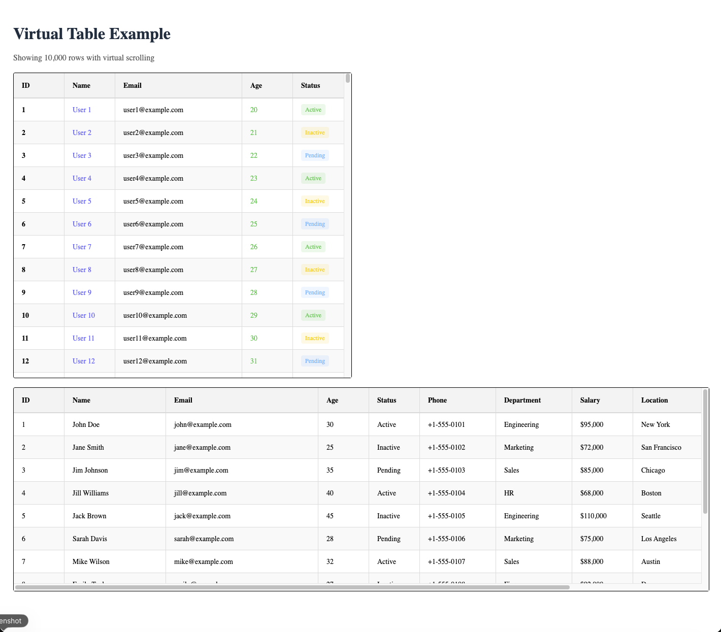 Performance Note: Even with 10,000 rows, only ~15-20 DOM nodes (visible rows + overscan) are rendered at any time. The table maintains smooth scrolling and low memory usage regardless of dataset size.