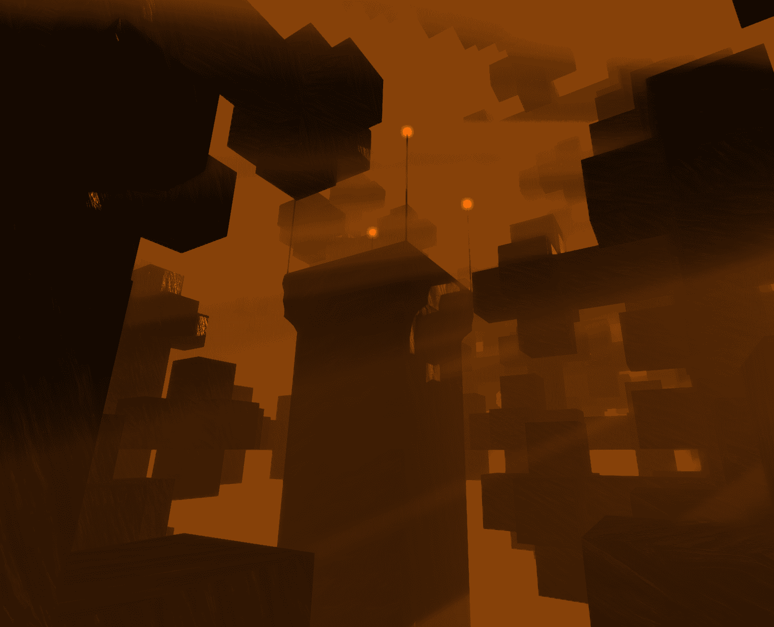 | !A screenshot of the three-good-godrays demo showing a scene with volumetric lighting and godrays. A bright pink light shines through a vertical array of black slats set in the side of a huge indistinct black structure in the background. There are very prominent and intense godrays in the air, giving it the appearance of being very humid or smokey. The ground is rock and there are black pillars casting long and stark shadows across it. | !A screenshot of the smoke level. Shows intense orange fog and godrays, floating fractal structures composed out of large dark cubes with stone-like texturing and patterns, and four orange/yellow lights glowing in the distance supported by long poles. |