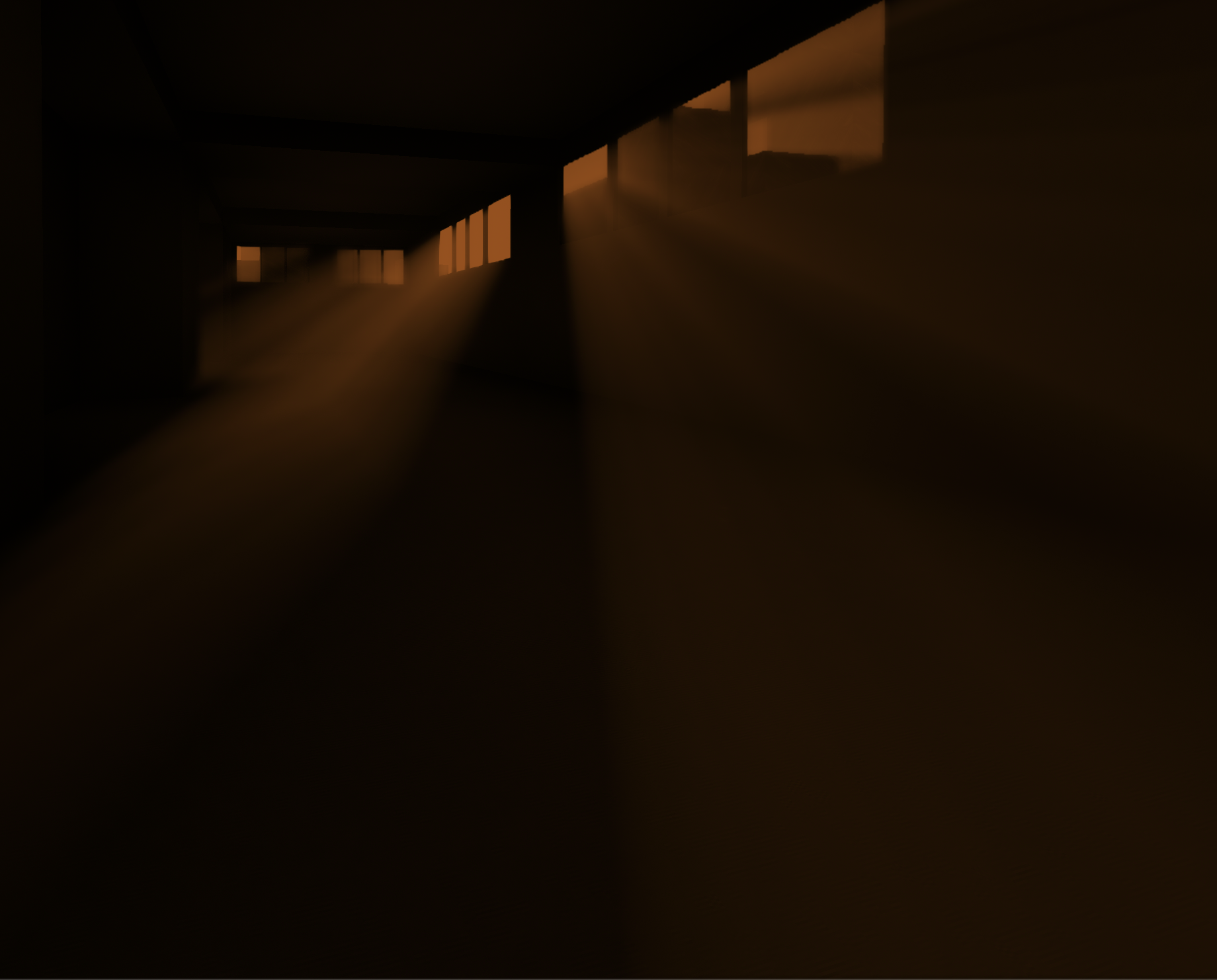 | !A screenshot showing the three-good-godrays effect in action within the sponza demo scene. A white sphere in the middle of a terrace with pillars has white godrays emanating from it along with prominent shadows. | !Another screenshot from the smoke level. Shows a hallway with some windows through with very prominent orange godrays are shining in. The interior is very dark and the outside has very little apparent structure other than an orange sky. |